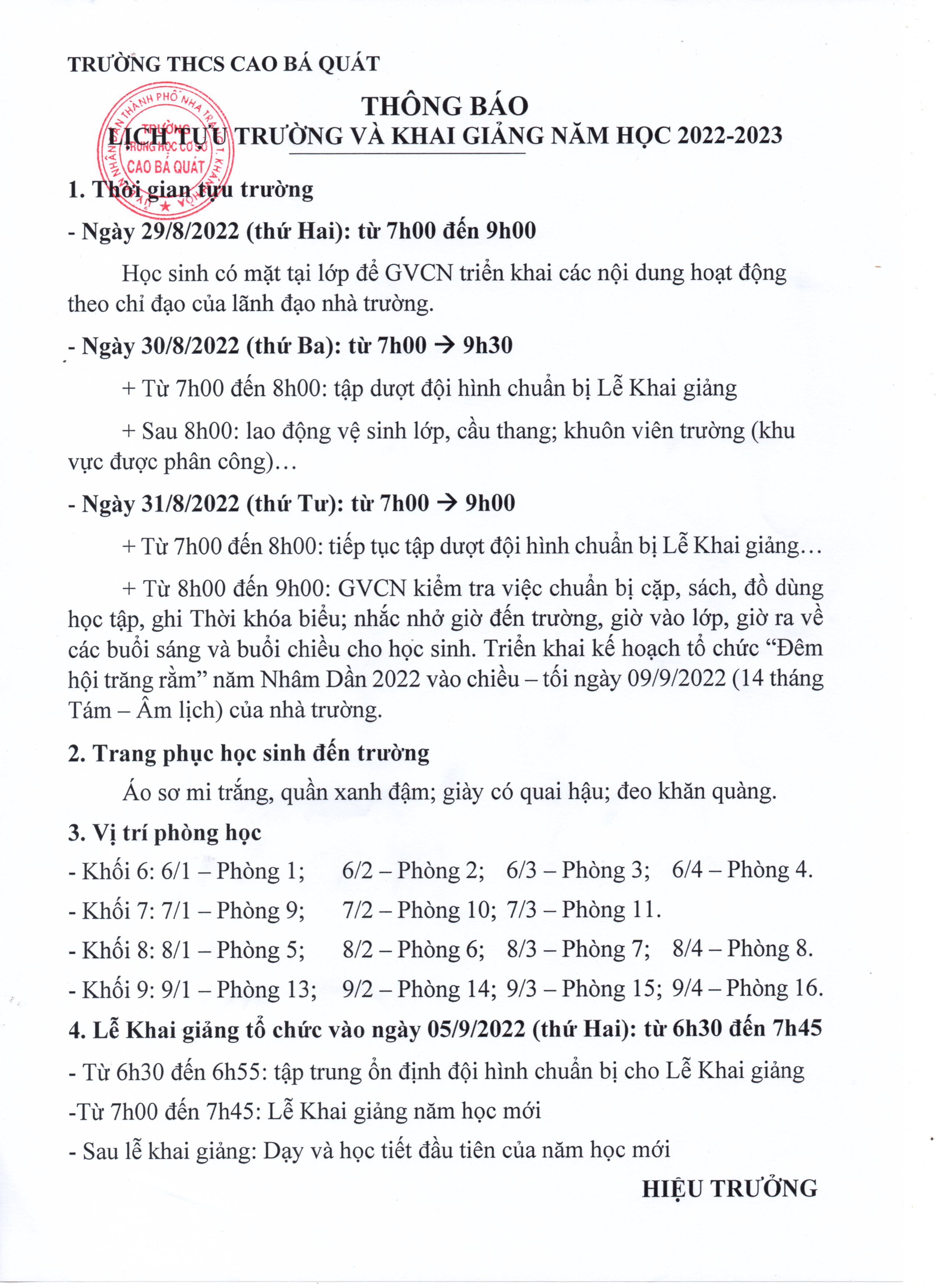 THÔNG BÁO NGÀY TỰU TRƯỜNG VÀ DANH SÁCH HỌC SINH LỚP 6