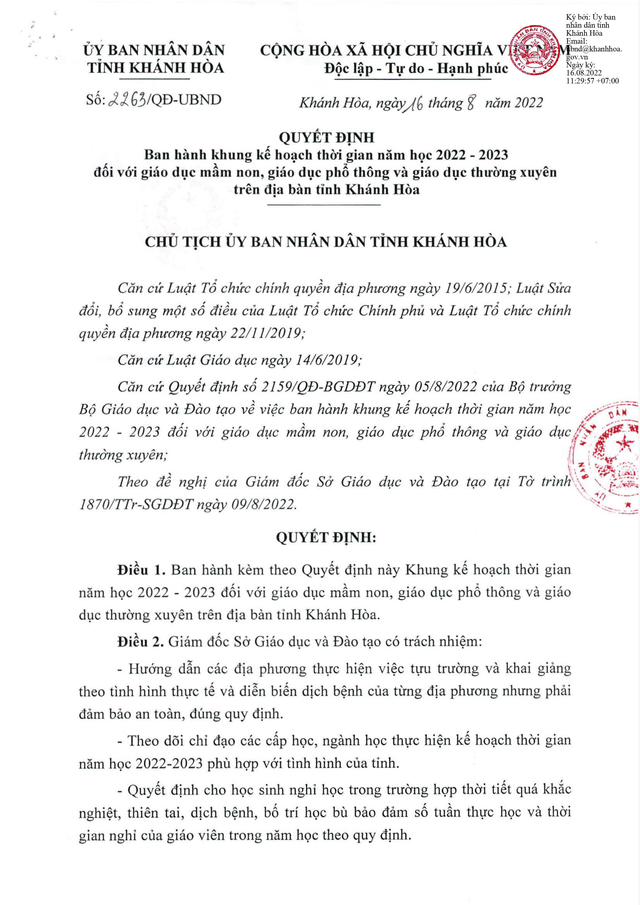 Quyết định 2263/QĐ-UBND tỉnh Khánh Hòa ngày 16 tháng 8 năm 2022