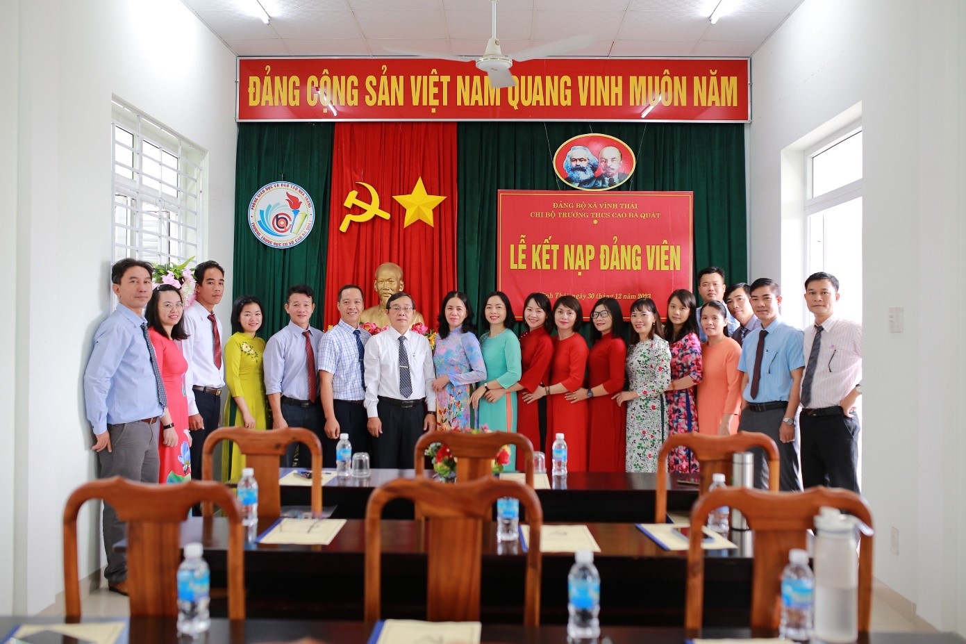 Sáng nay ngày 30 tháng 12 năm 2023, chi bộ trường THCS Cao Bá Quát tổ chức lễ kết nạp đảng viên mới cho quần chúng Phạm Thắng là nhân viên bảo vệ của nhà trường. Về tham dự có đồng chí Nguyễn Thị Xuân Lan - Phó Bí thư Thường trực Đảng ủy xã Vĩnh Thái, bà Phan Thị Kim Lan - Chủ tịch Công đoàn trường, ông Phạm Minh Vũ - Tổ trưởng Tổ Toán, Tin, Nghệ thuật, GDTC; ông Phan Công Biện - giáo viên môn Vật lý, bà Ngô Thị Thu Hà - giáo viên môn Sinh học là những quần chúng ưu tú đã qua lớp bồi dưỡng nhận thức về đảng.