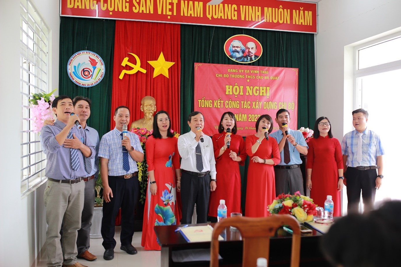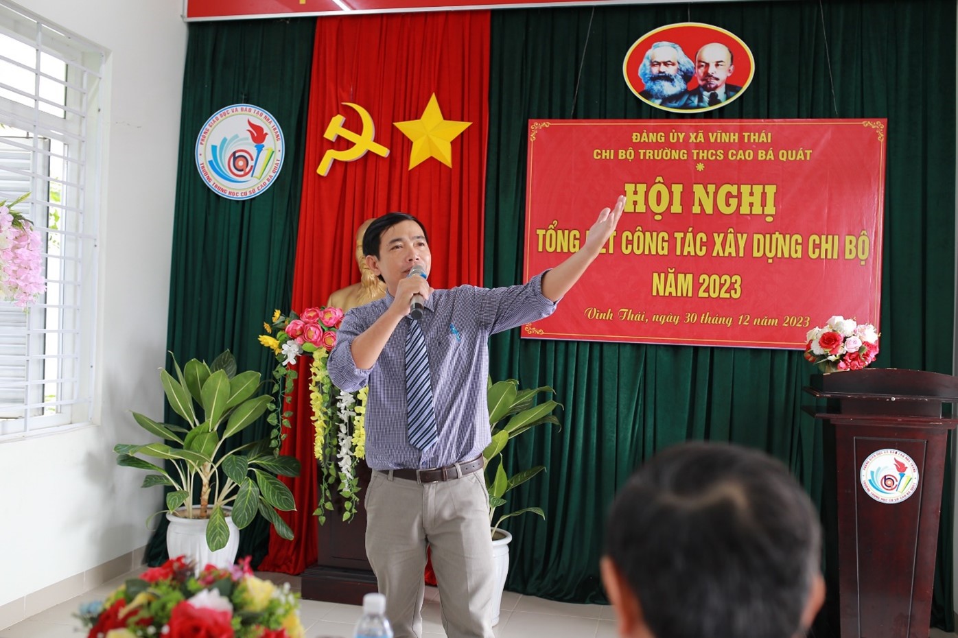 Sáng 30 tháng 12 năm 2023, chi bộ trường THCS Cao Bá Quát tổ chức Hội nghị Tổng kết công tác xây dựng chi bộ năm 2023 và triển khai Phương hướng công tác năm 2024. Về tham dự có đồng chí Nguyễn Thị Xuân Lan - Phó Bí thư Thường trực Đảng ủy xã Vĩnh Thái, bà Phan Thị Kim Lan - Chủ tịch Công đoàn, ông Phạm Minh Vũ - Tổ trưởng Tổ Toán, Tin, Nghệ thuật, GDTC; các ông (bà) là quần chúng ưu tú đã qua lớp bồi dưỡng nhận thức về đảng.